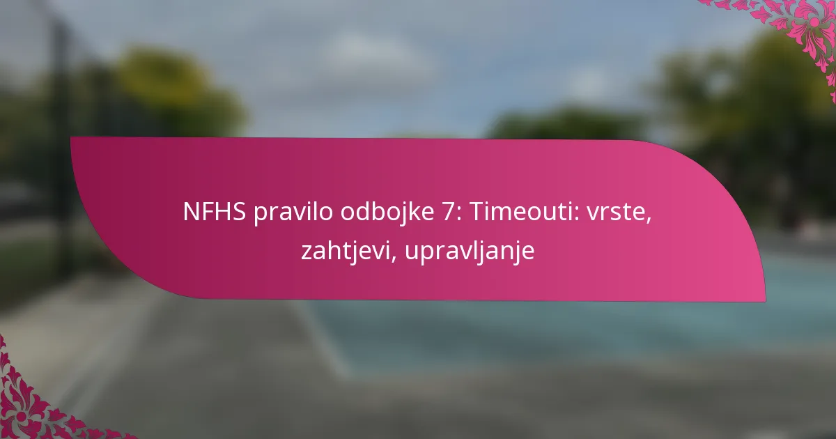NFHS Pravilo 7 pruža sveobuhvatne smjernice za upravljanje vremenskim prekidima u odbojci, uključujući njihove vrste i odgovornosti igrača i službenih osoba. Vremenski prekidi su bitni za timove kako bi se reorganizirali, strategizirali i riješili umora igrača. Postoje tri glavne vrste vremenskih prekida – timski, službeni i zbog ozljede – svaka s posebnim pravilima koja utječu na dinamiku igre. Poznavanje procedura za traženje i upravljanje ovim vremenskim prekidima ključno je za učinkovitu igru.